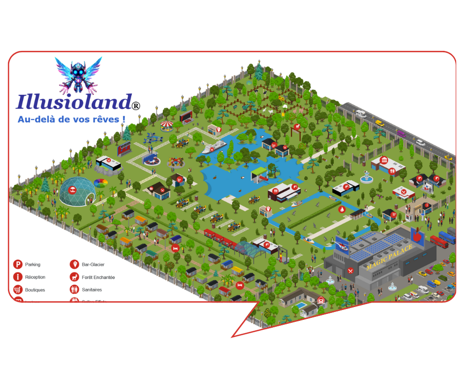 Illusioland est un parc à thème révolutionnaire et un centre d'innovation immersive, conçu pour offrir des expériences exceptionnelles qui fusionnent le divertissement, la technologie et la créativité. Situé au cœur d'une région stratégique et dynamique, Illusioland propose une expérience sans précédent, à la croisée de la réalité virtuelle, des illusions interactives et des spectacles grandioses.